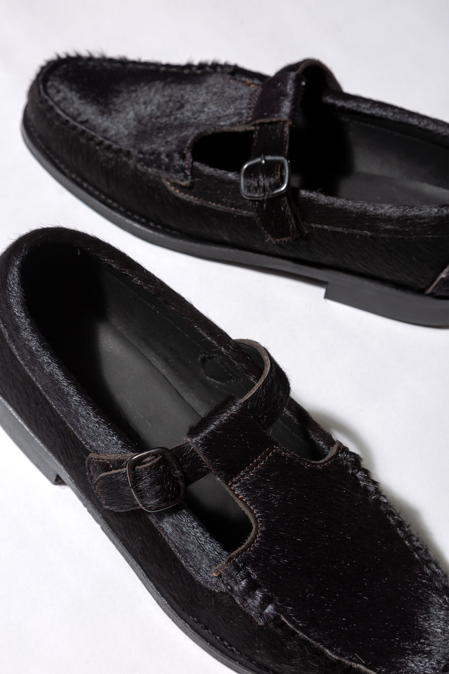 T-bar loafer crafted in Spanish calf hair. Hand-sewn using the traditional moccasin construction. The outsole is stitched to the upper for extra durability and flexibility.