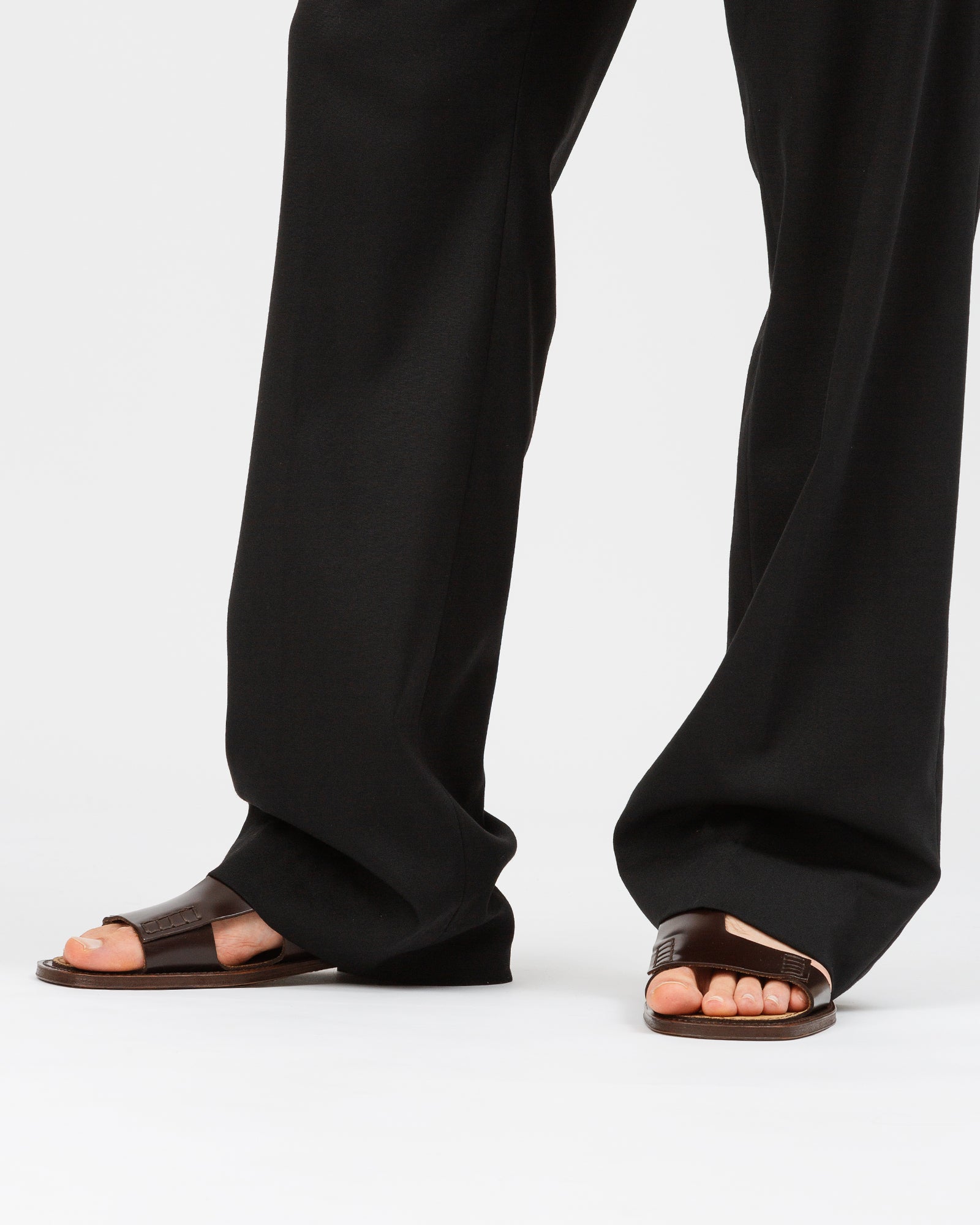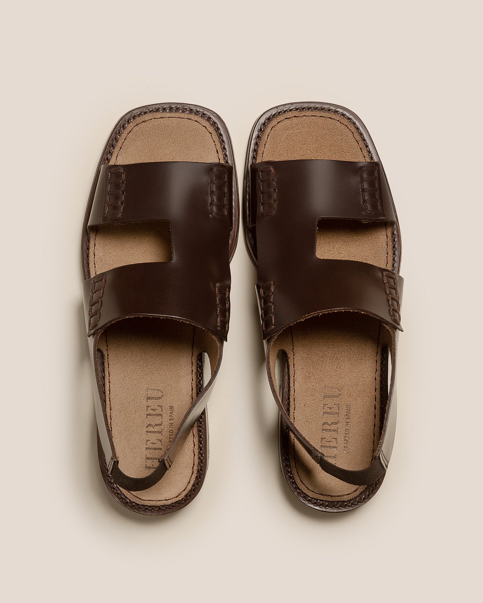 Slingback loafer sandal crafted in Spanish structured leather. Handsewn using the traditional moccasin construction. The outsole is stitched to the upper for extra flexibility and durability.