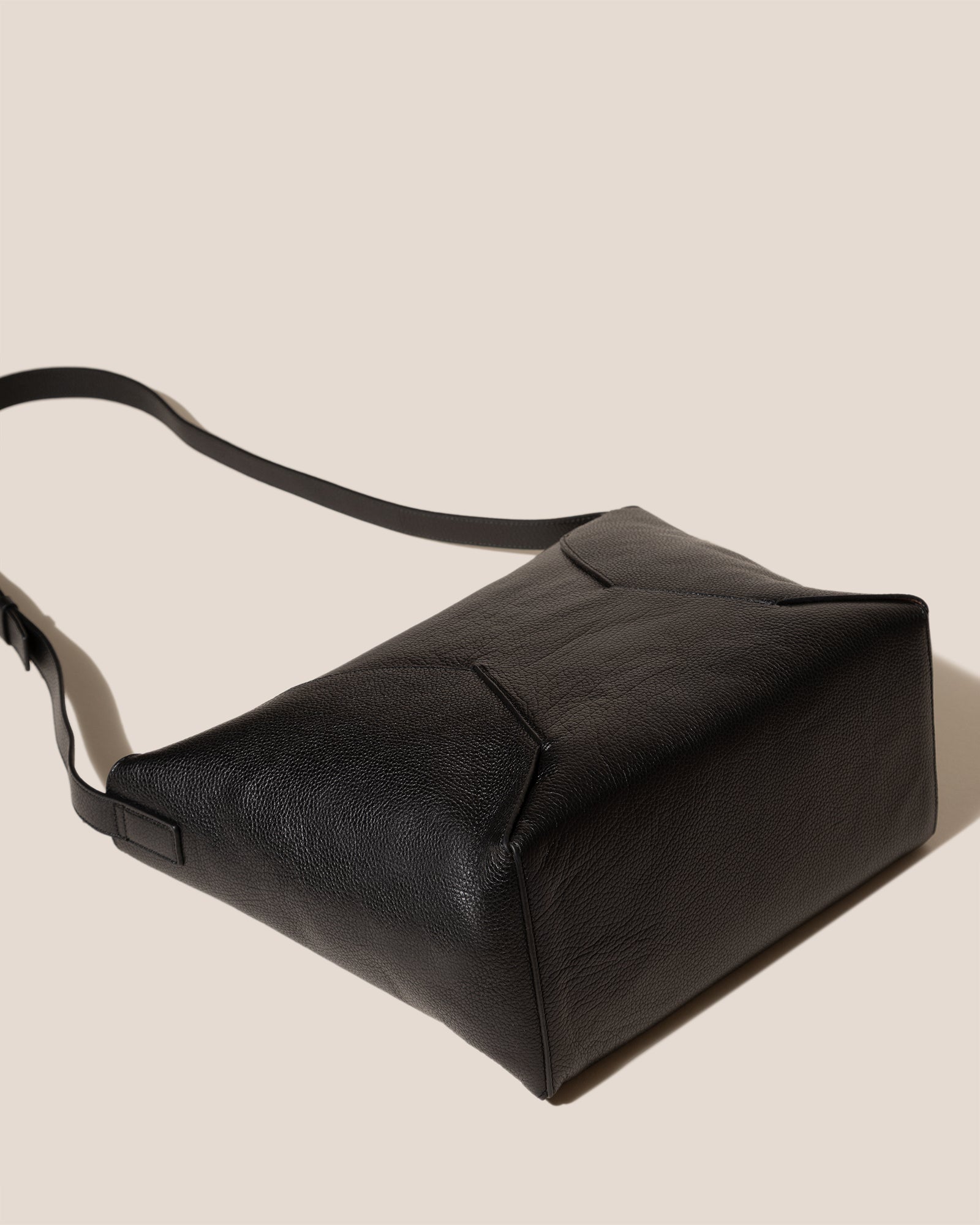 Medium-sized crossbody bag inspired by the traditional messenger shape. Crafted in grainy calf leather with a large woven front detail. Lined in a blend of calf suede and cotton for structure and durability.