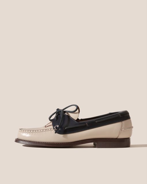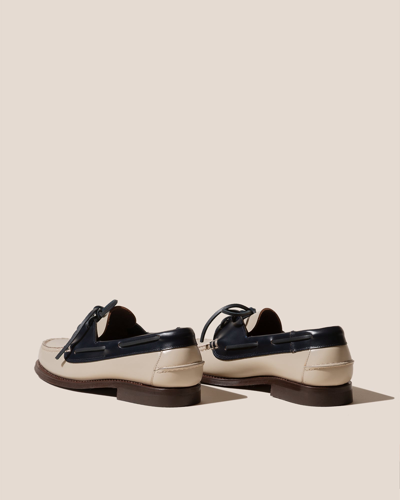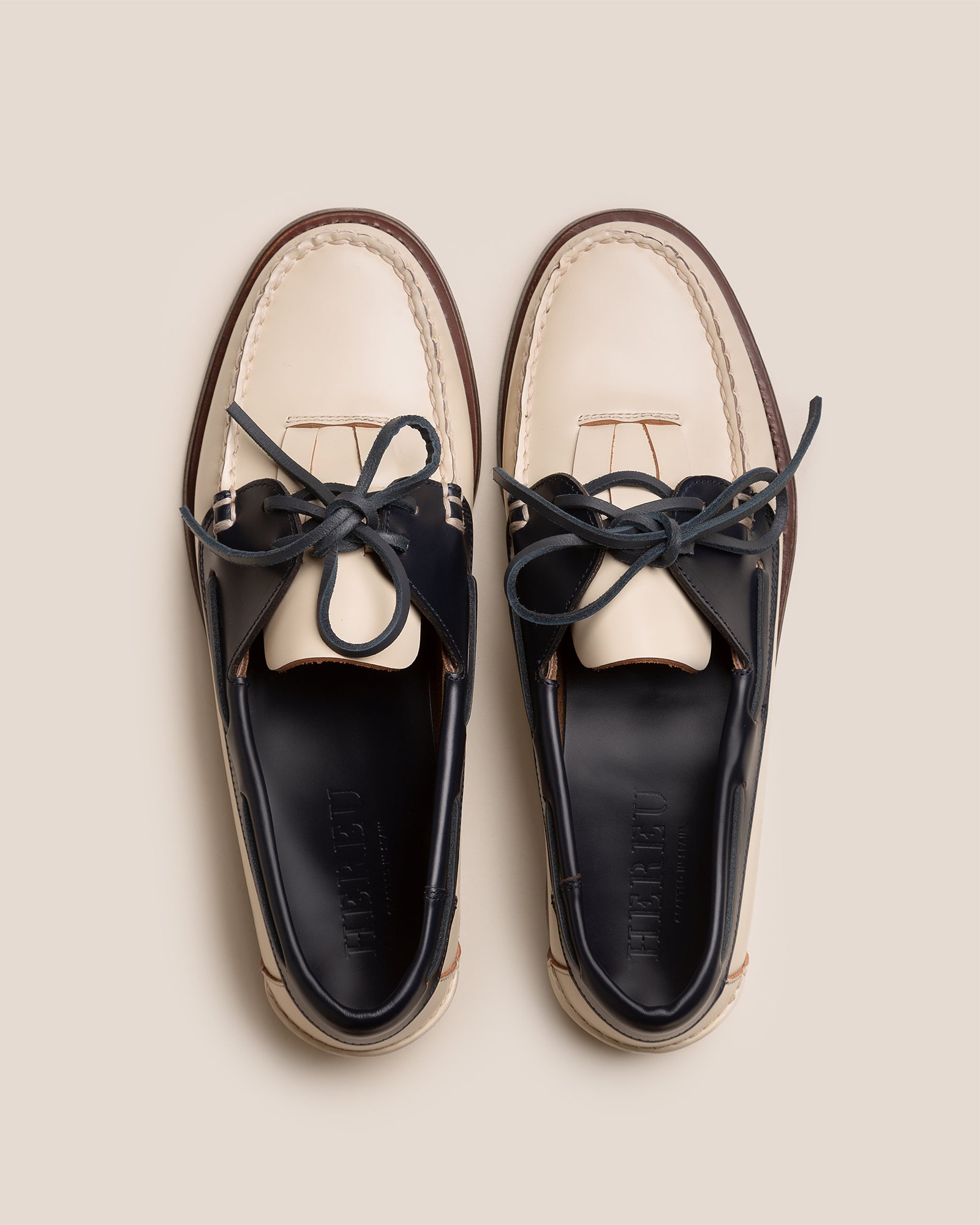 Two-tone slip-on loafer with lace detail, crafted in Spanish structured calf leather. Designed with a timeless silhouette, this contemporary style reinterprets the classic Spanish nautical loafer.