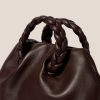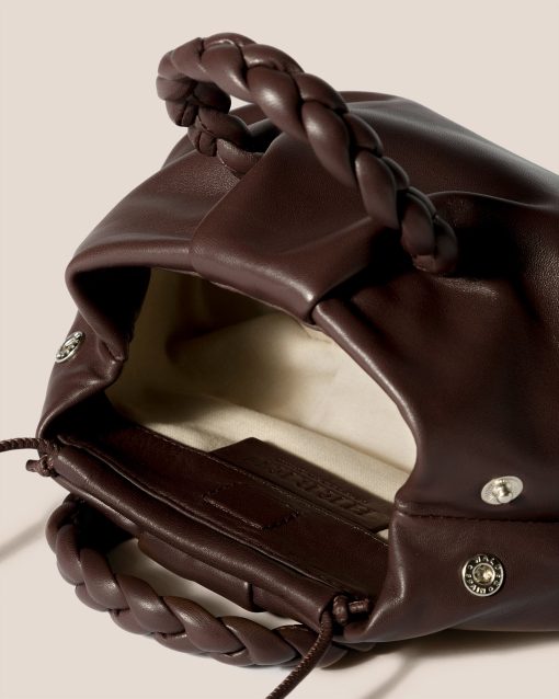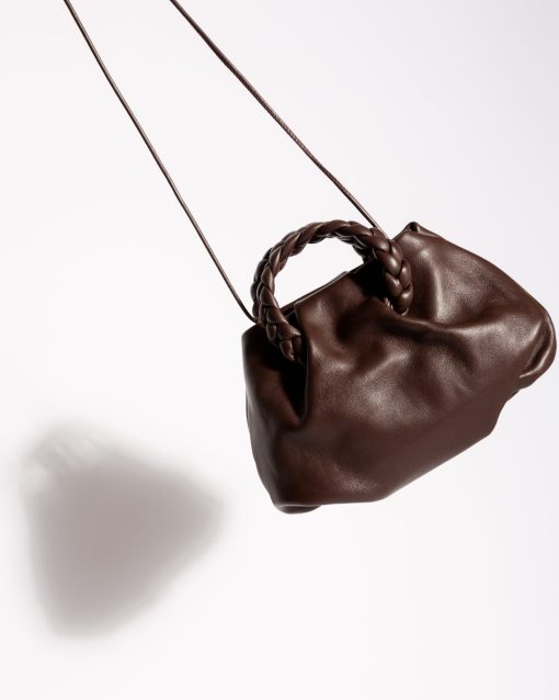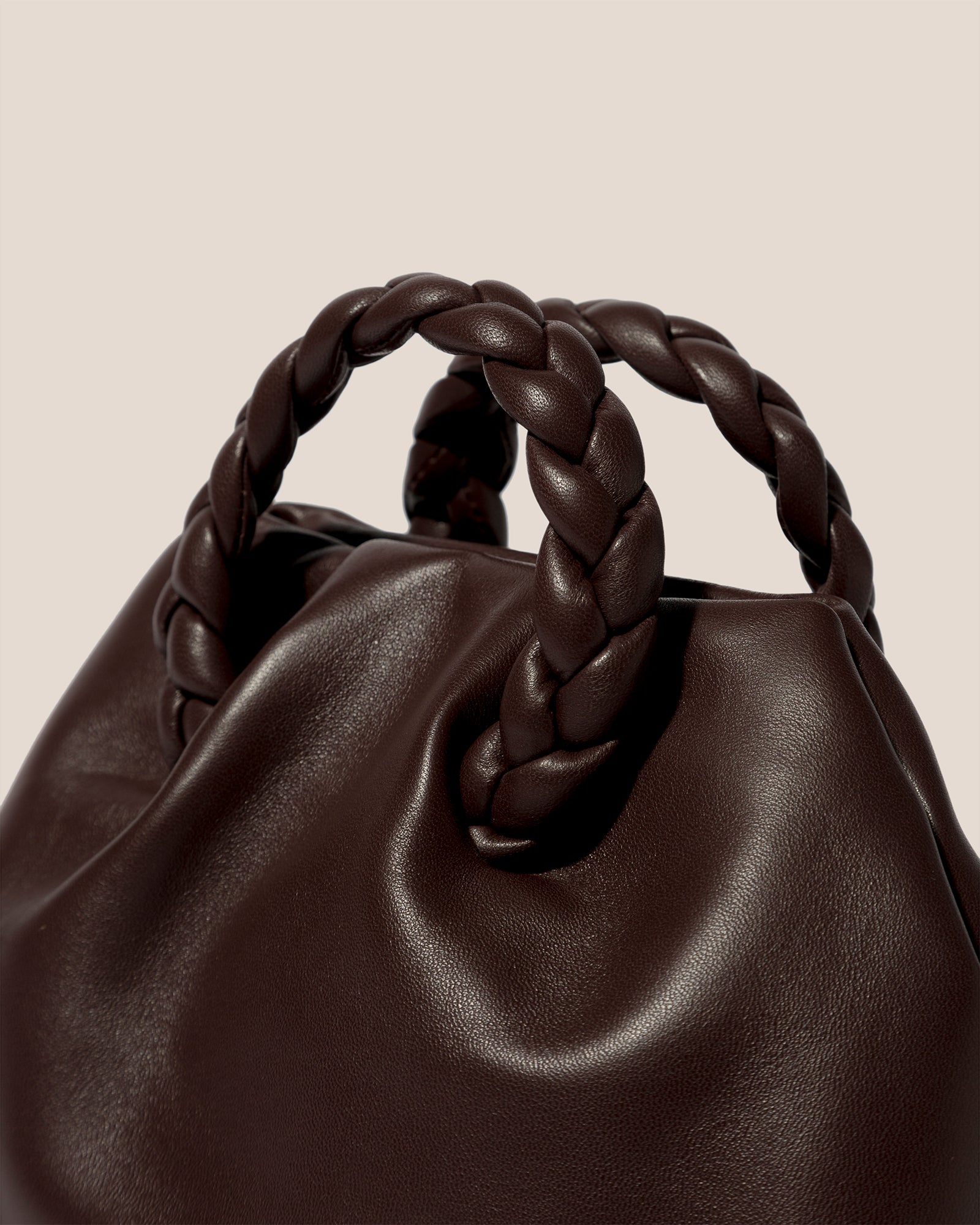 Small leather handbag with braided leather handles. With a slim adjustable strap, it can be carried as a crossbody or by hand. Crafted in supple lambskin lined with organic cotton canvas.