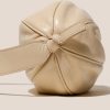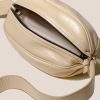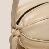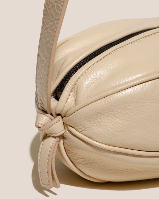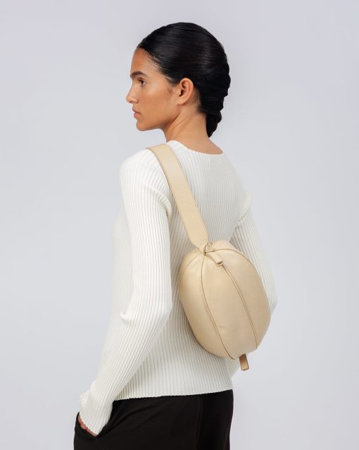 Large elongated ball-shape crossbody bag with knotted side details. Crafted in distressed calf leather and lined with organic cotton canvas.
