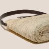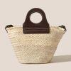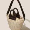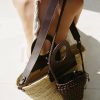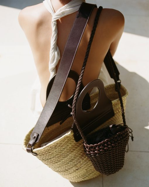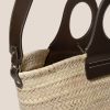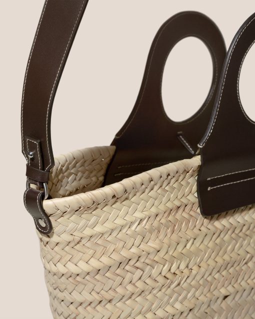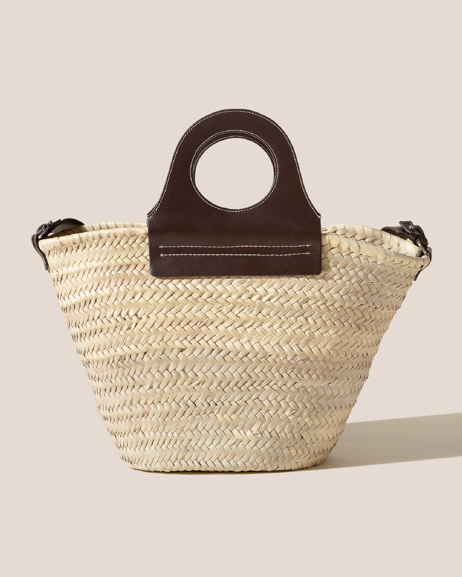 Handwoven straw basket with round cut-out handles crafted in calf leather.