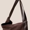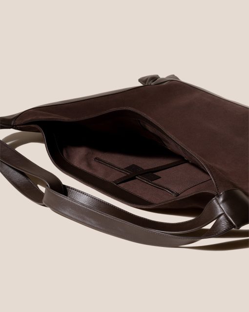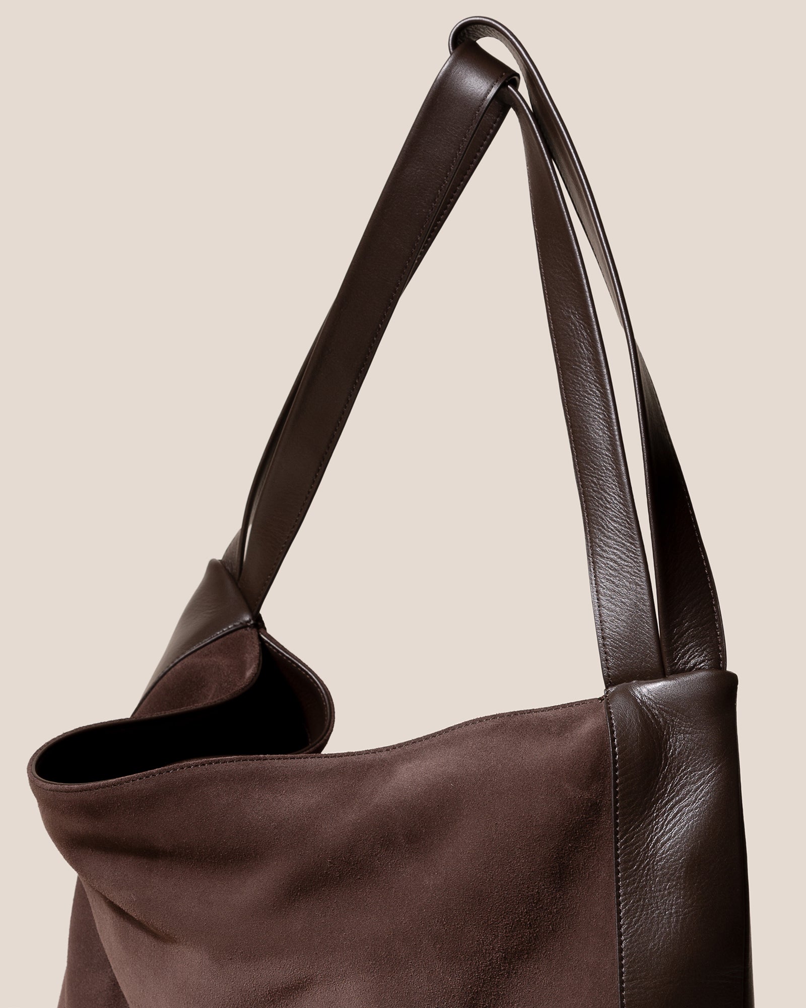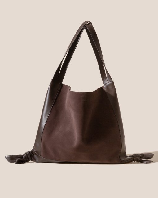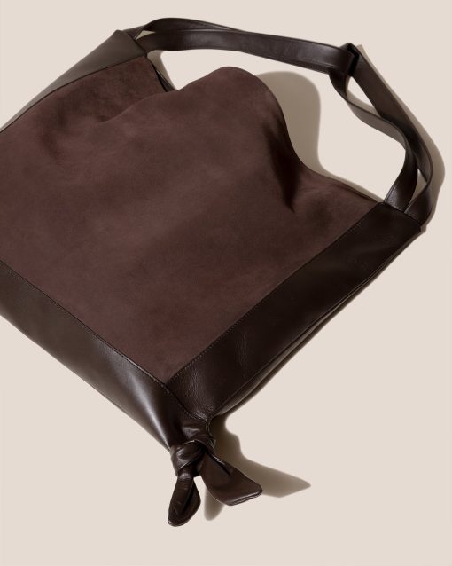 Slouchy shoulder bag crafted in calf suede, with soft calf leather handles and knotted accents.
