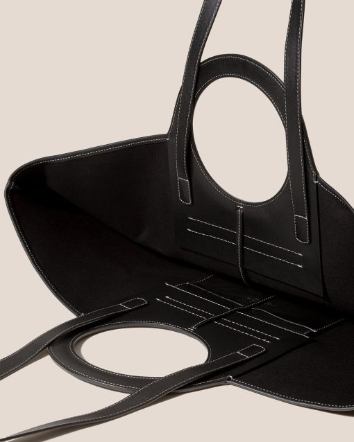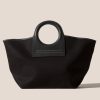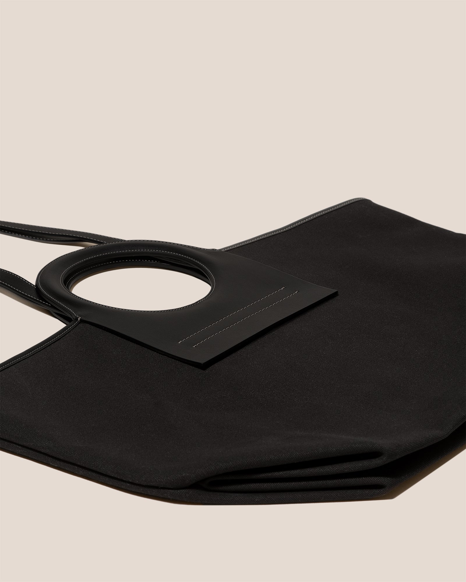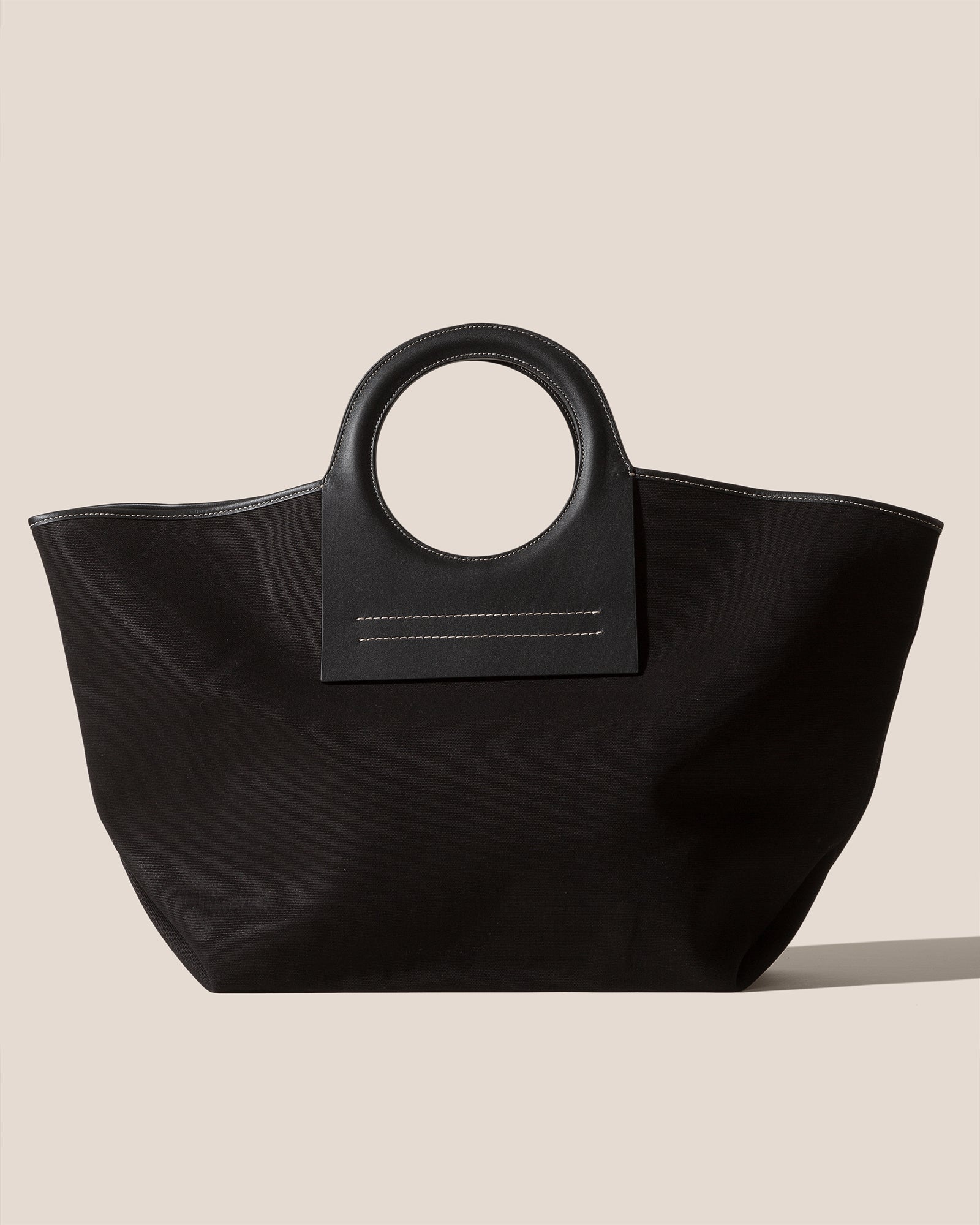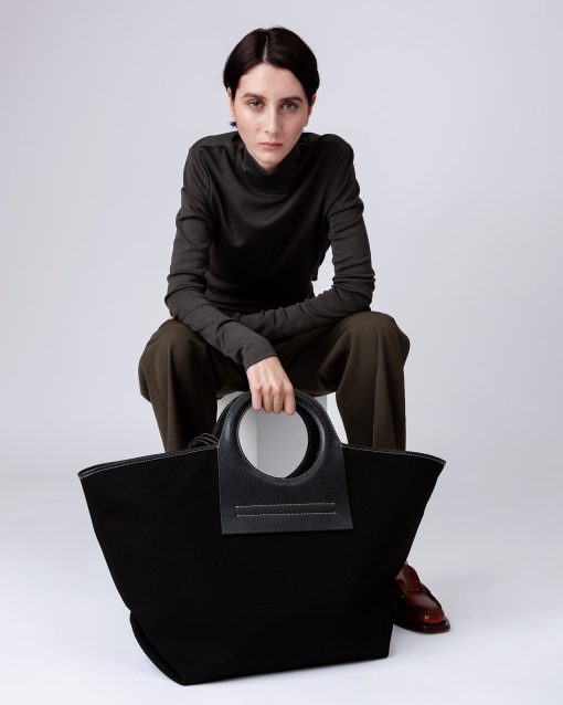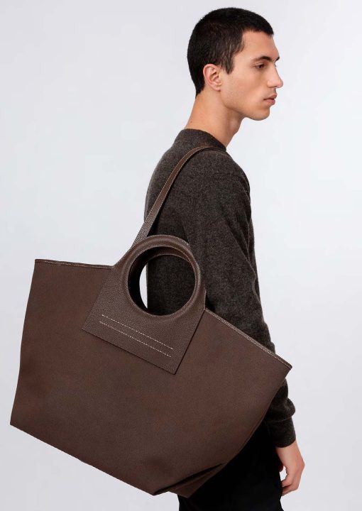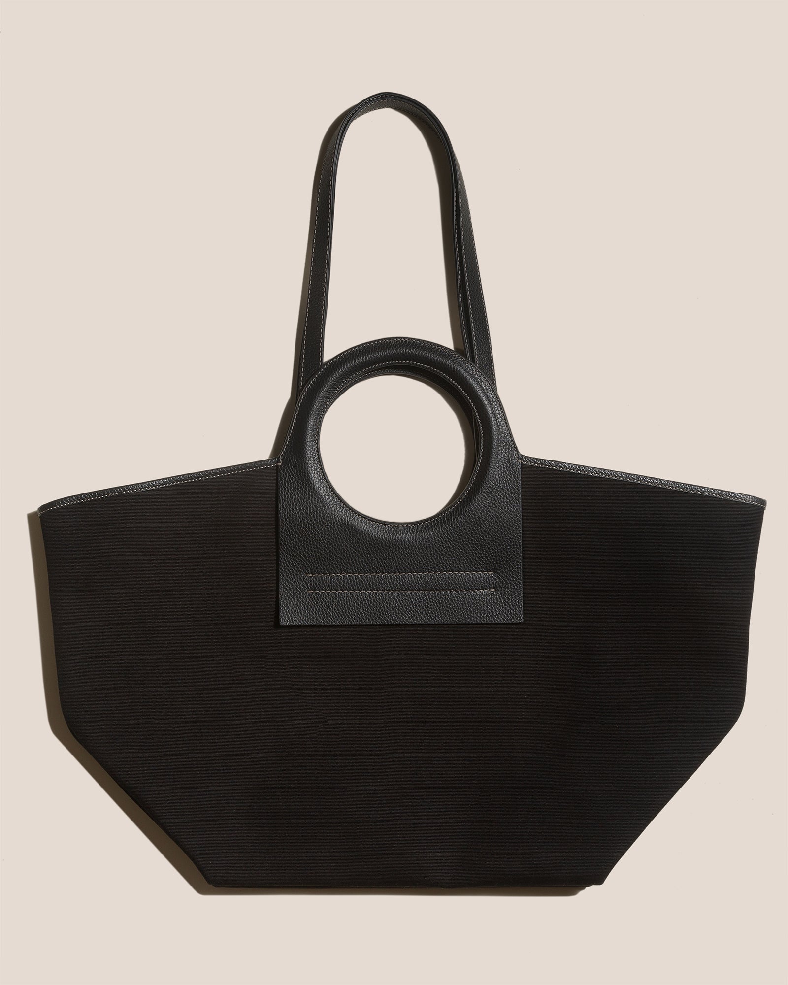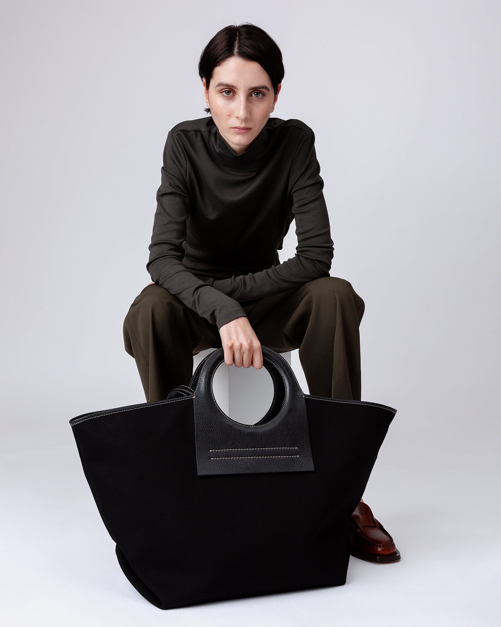 Tote bag constructed from premium ecru canvas with leather handles and trims, lined with natural cotton canvas.