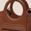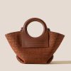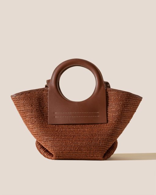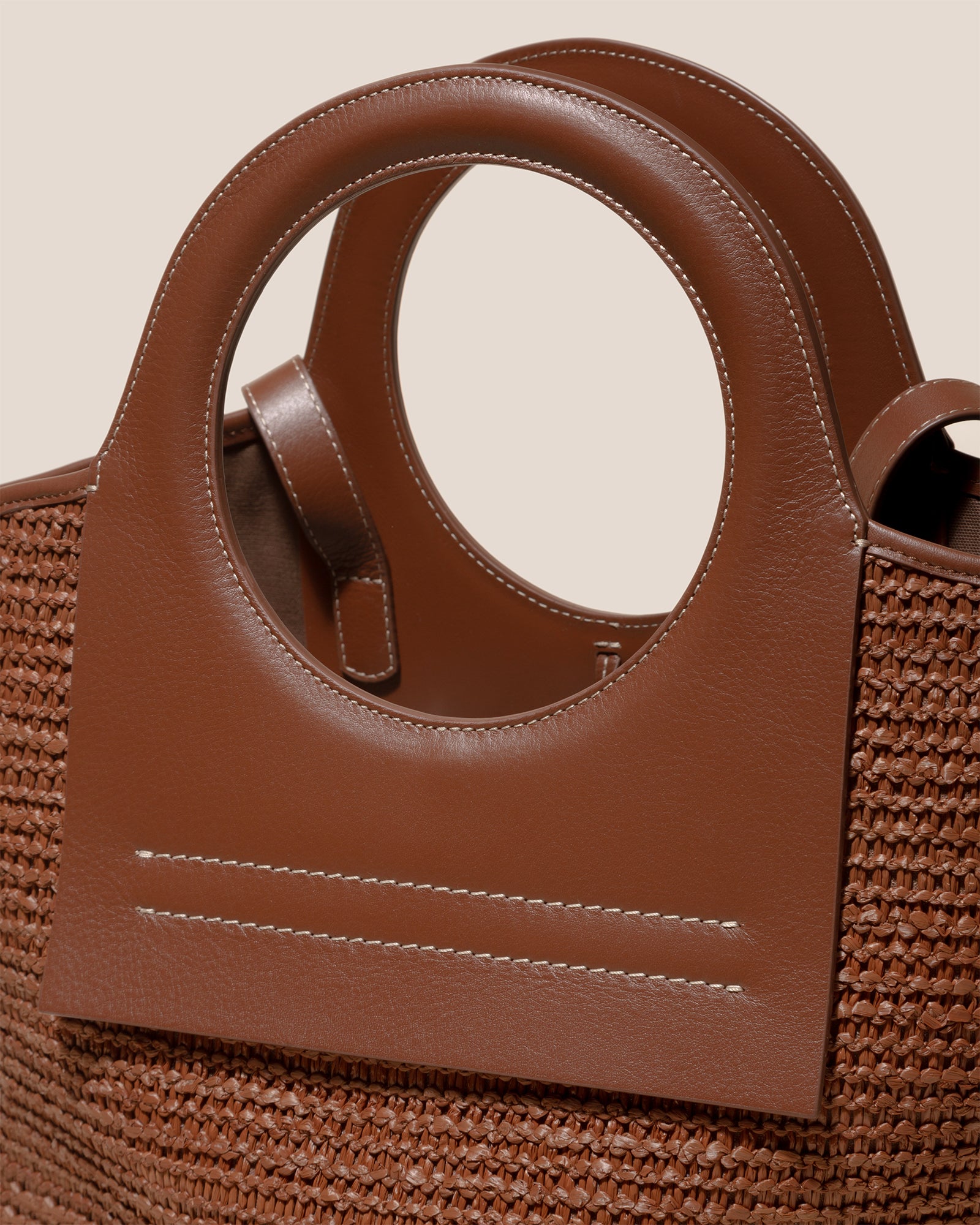 Tote bag constructed from natural raffia with calf leather handles and trims, lined with organic cotton canvas.