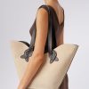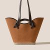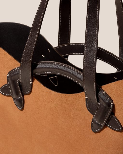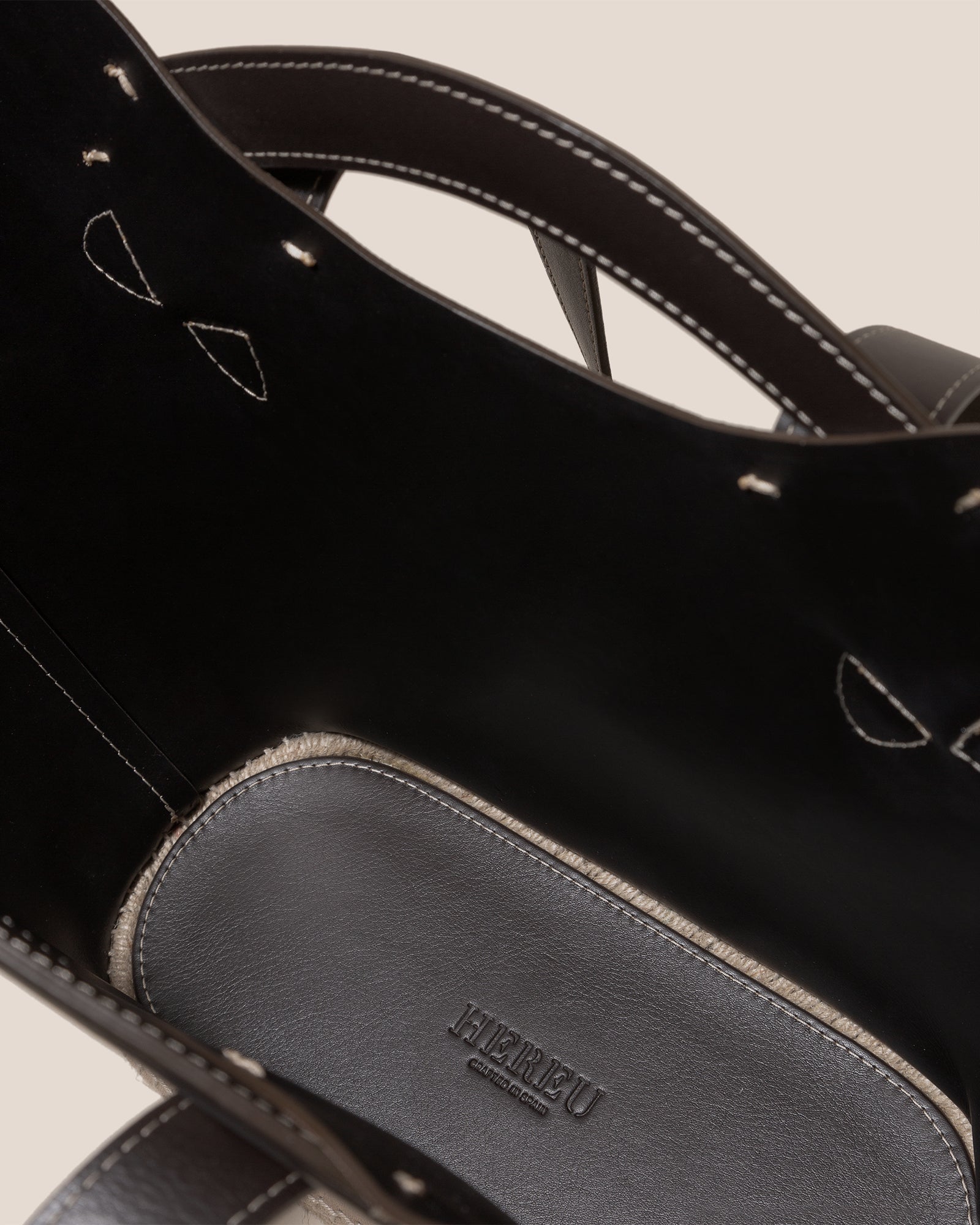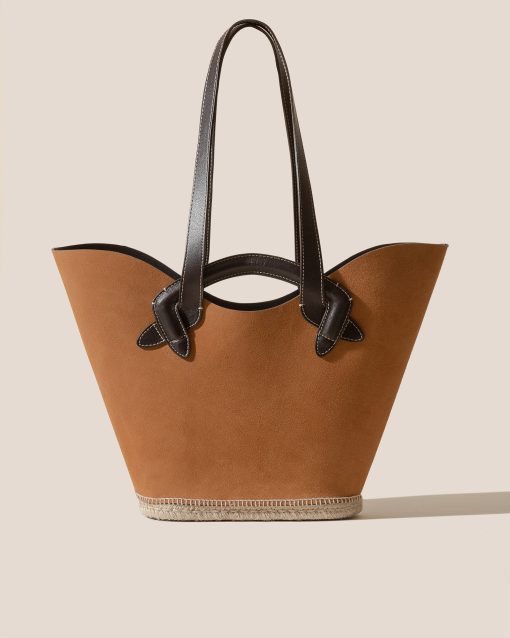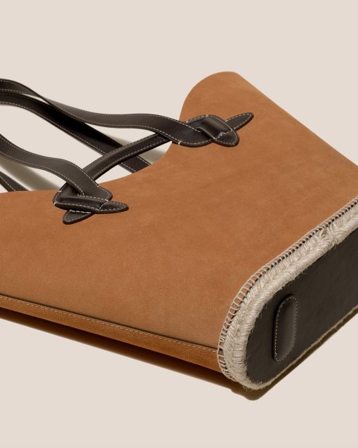 Tote crafted in calf suede leather, trimmed with smooth calf leather, finished with an espadrille base. The interior is coated for added durability.