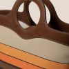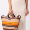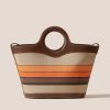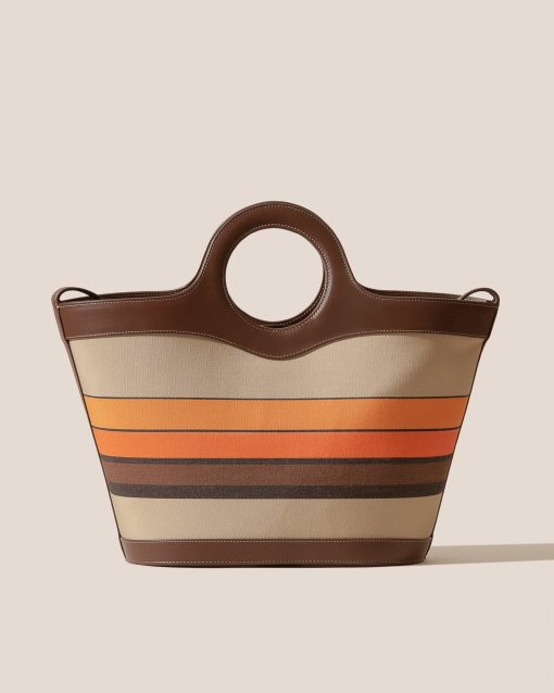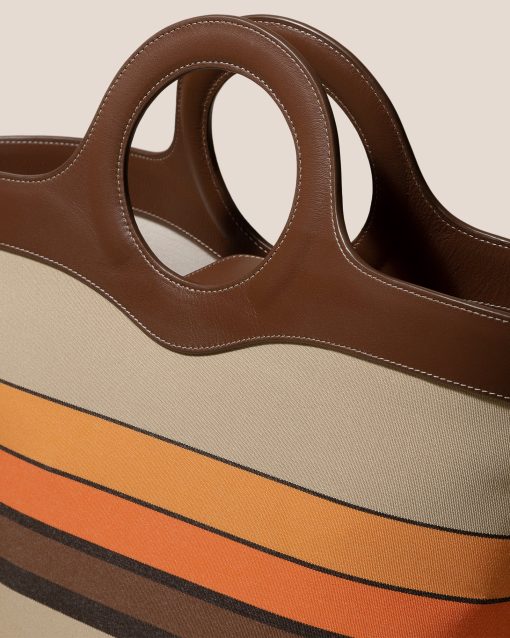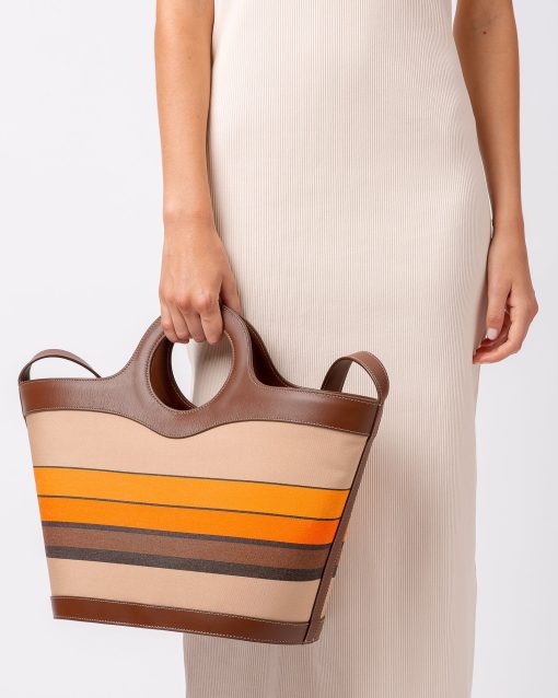 Tote crafted from the same durable fabric used for the vibrant awnings that line Spanish coastal apartments – a material designed to withstand sun, salt, and time – and round cut-out supple calf leather handles.