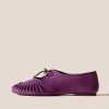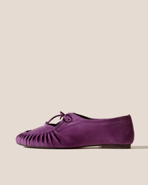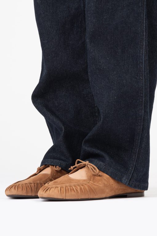 Flat lace-up shoe with pleated front detail, crafted in goat suede.