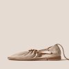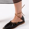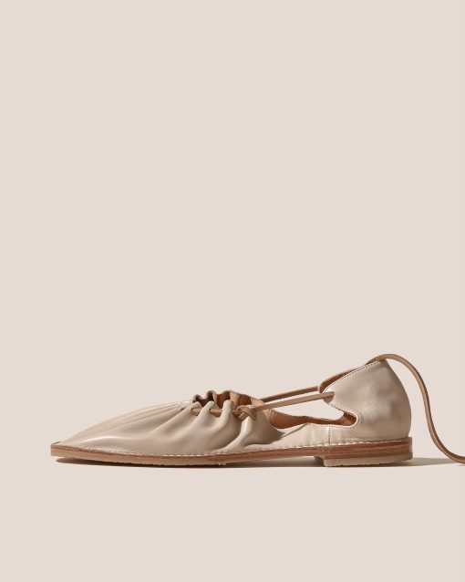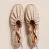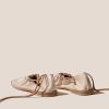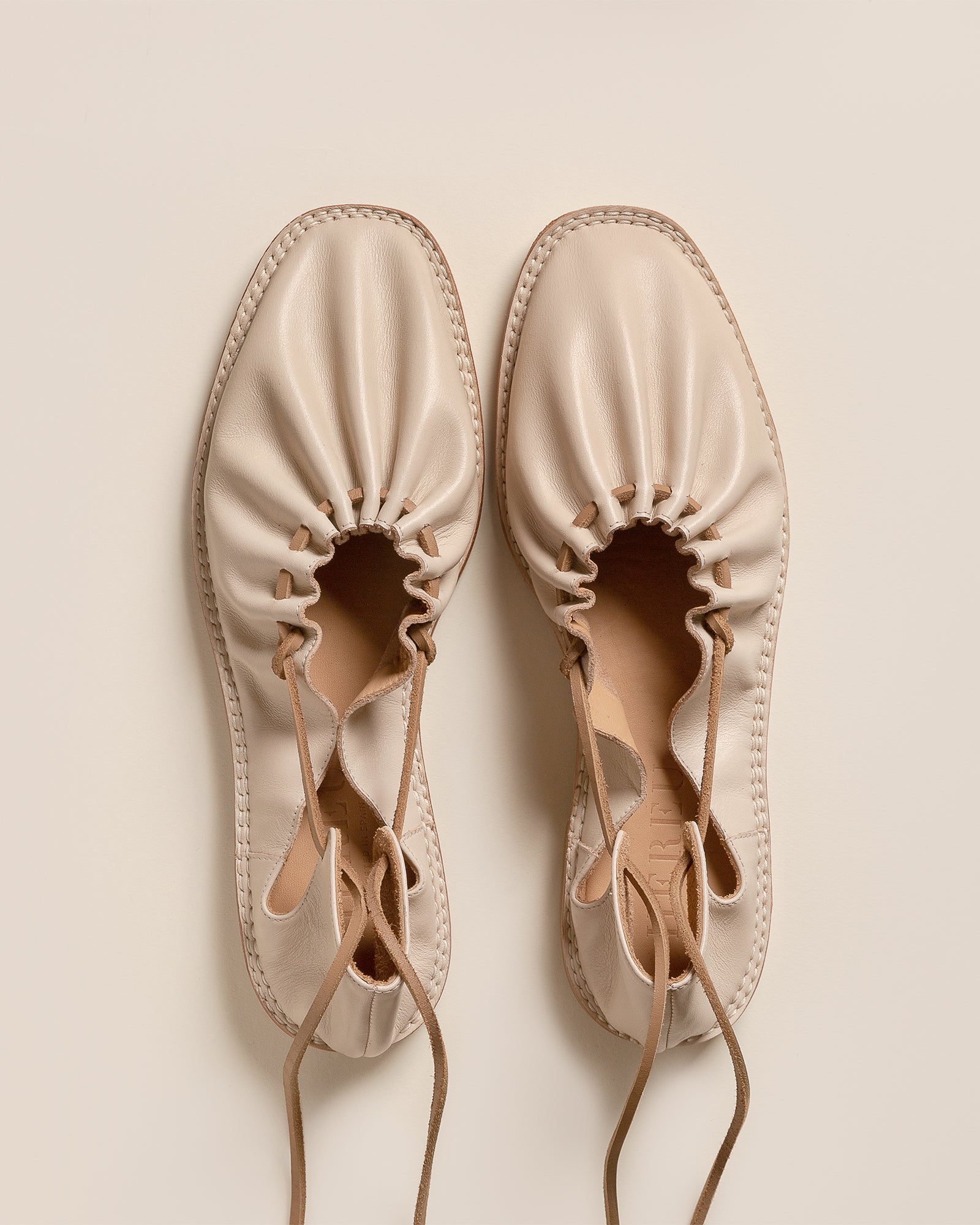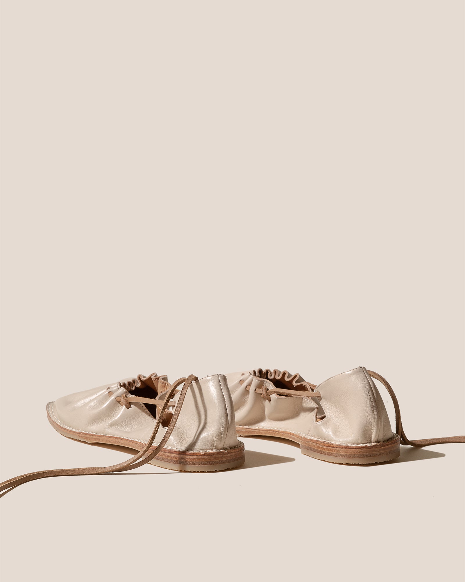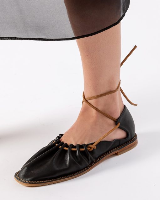 Gathered ankle lace pump, crafted in shiny soft calf leather.