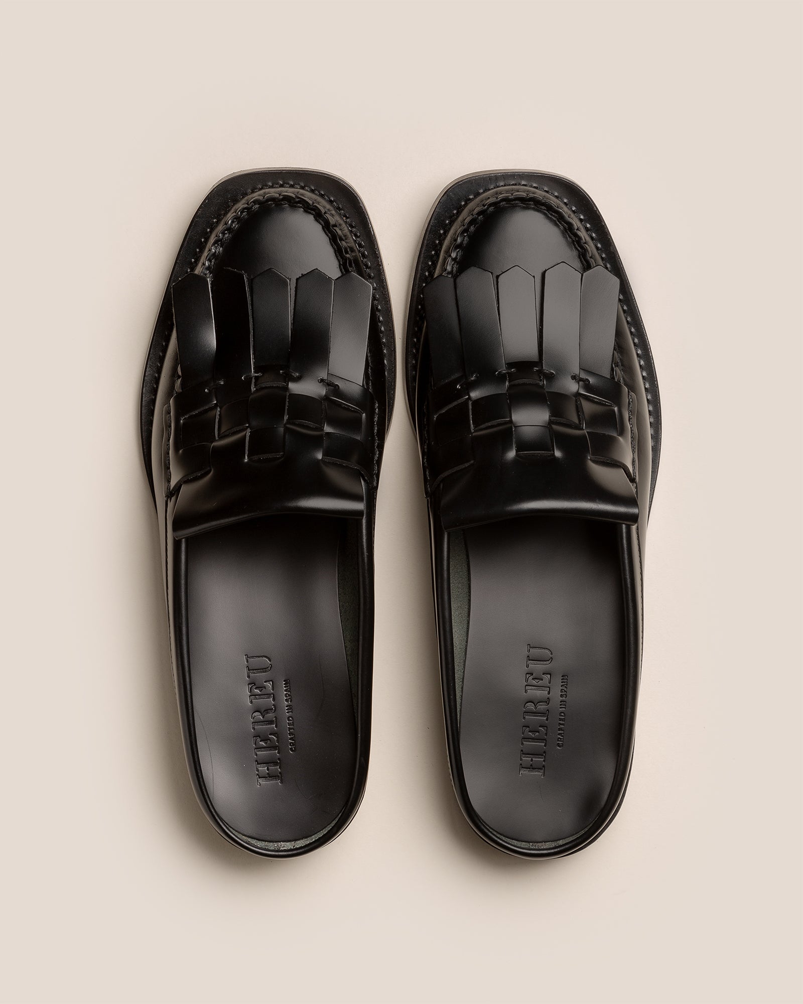 Mule loafer with interwoven fringe detailing, crafted in structured calf leather.