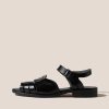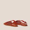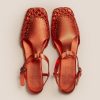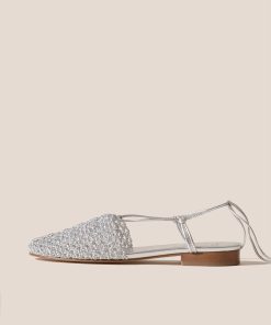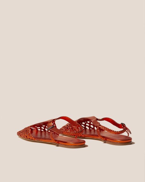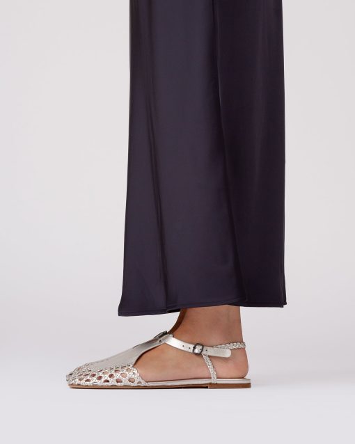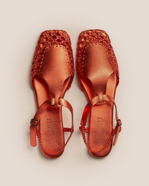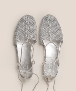 Square toe hand-woven t-bar sandal crafted in metallic calf leather.