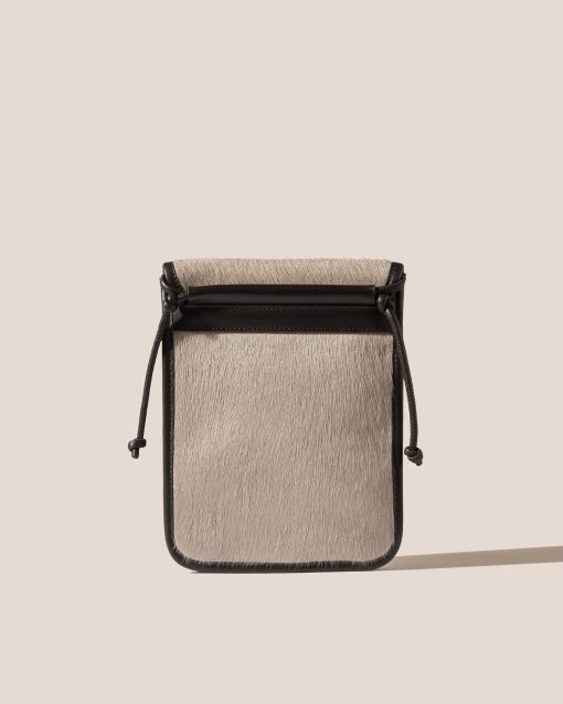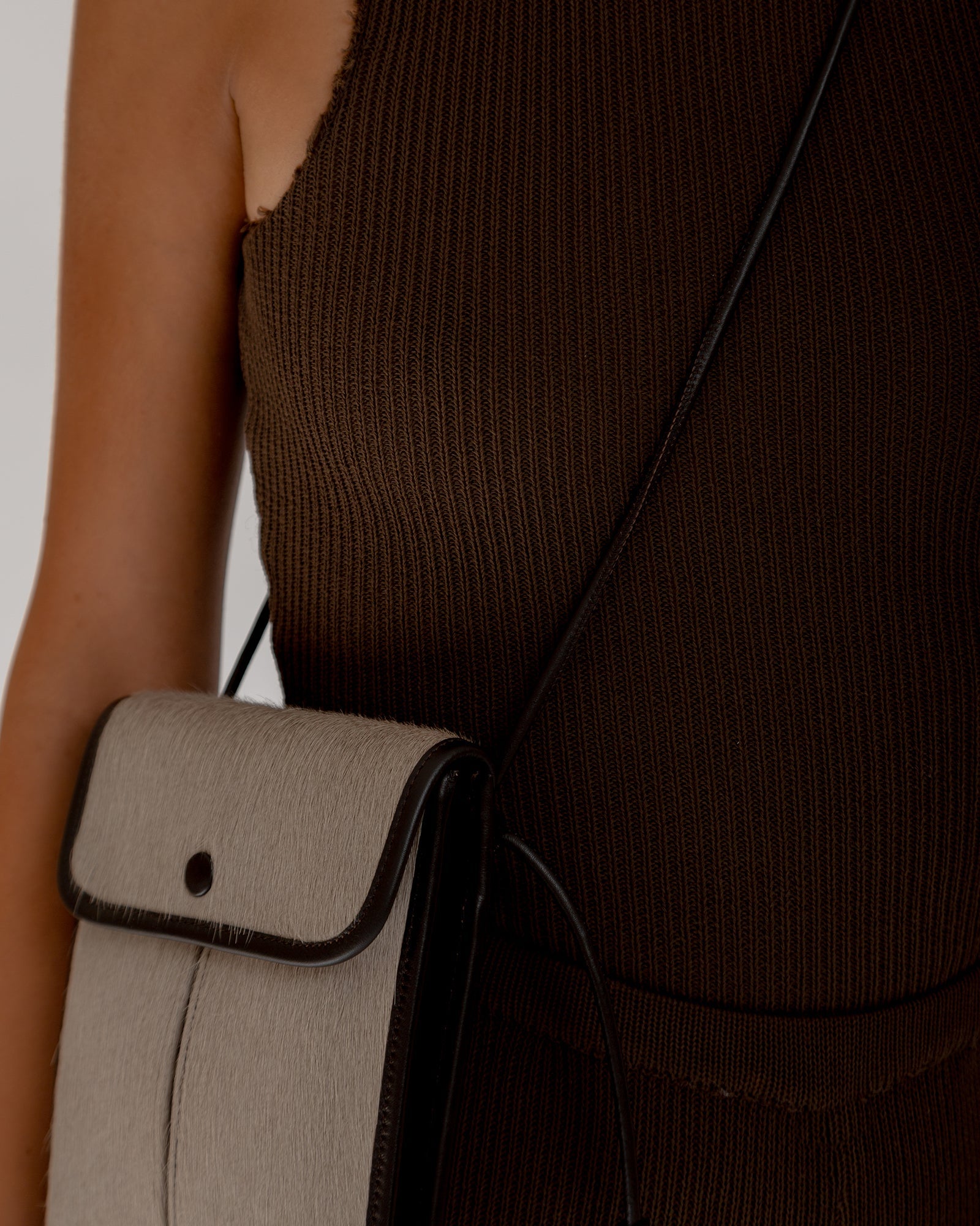 Square flat crossbody crafted in European calf hair and trimmed with calf leather. Organic cotton lining.
