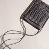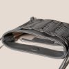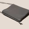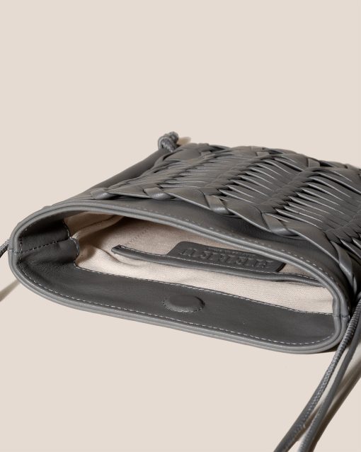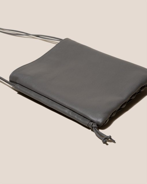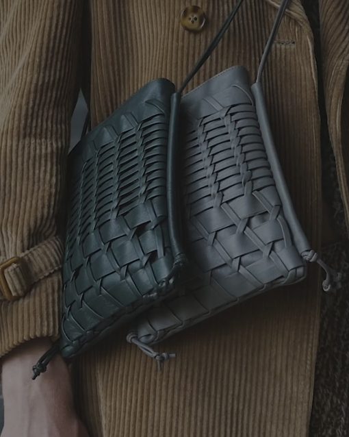 Flat square crossbody bag crafted in soft calf leather, with a handwoven front pocket.