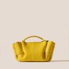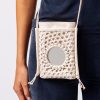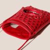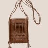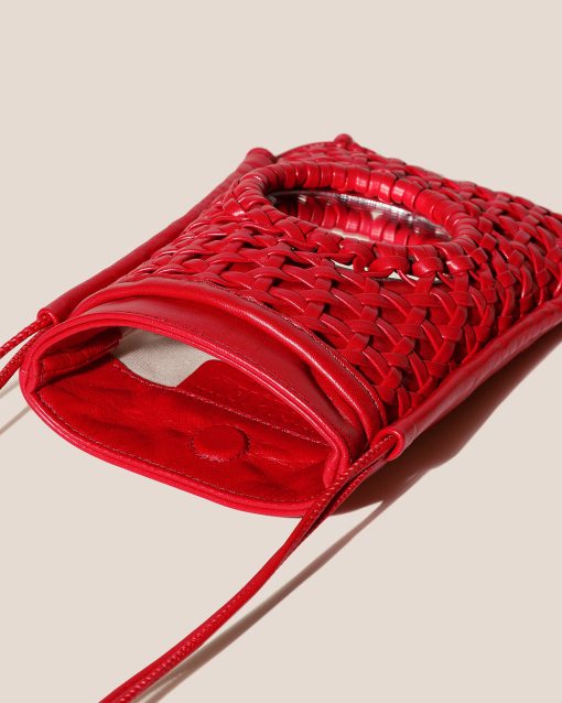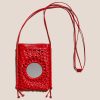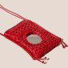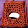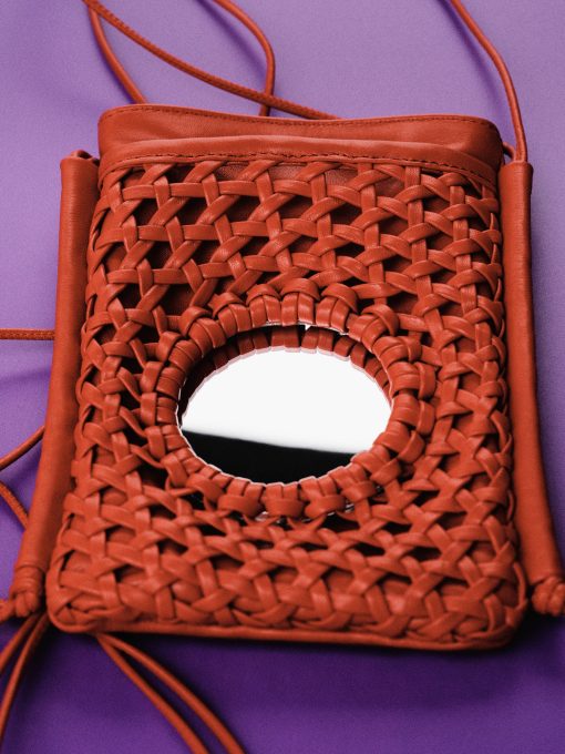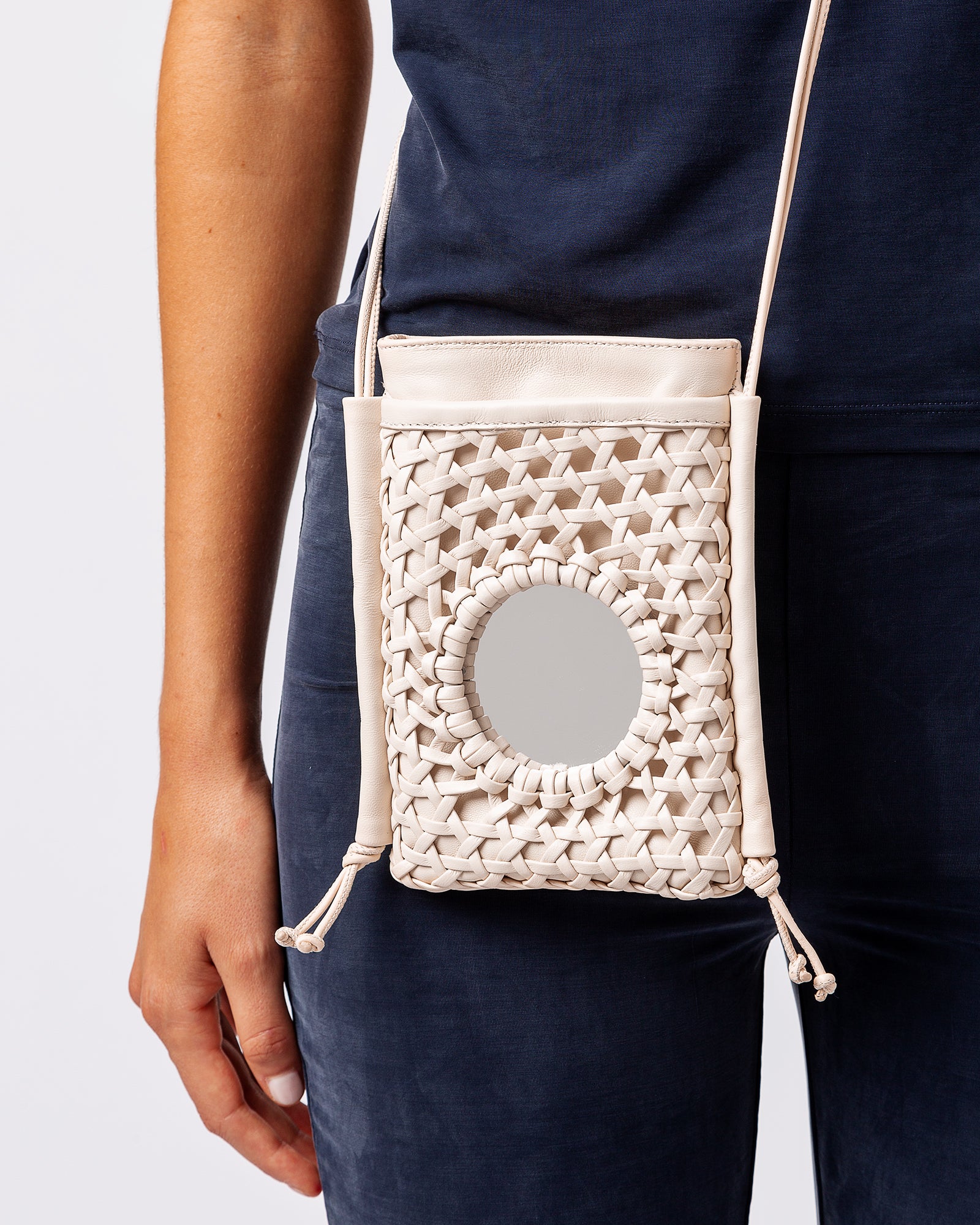 Mini flat square crossbody bag crafted from soft lambskin, featuring a braided front detail with a small round mirror.